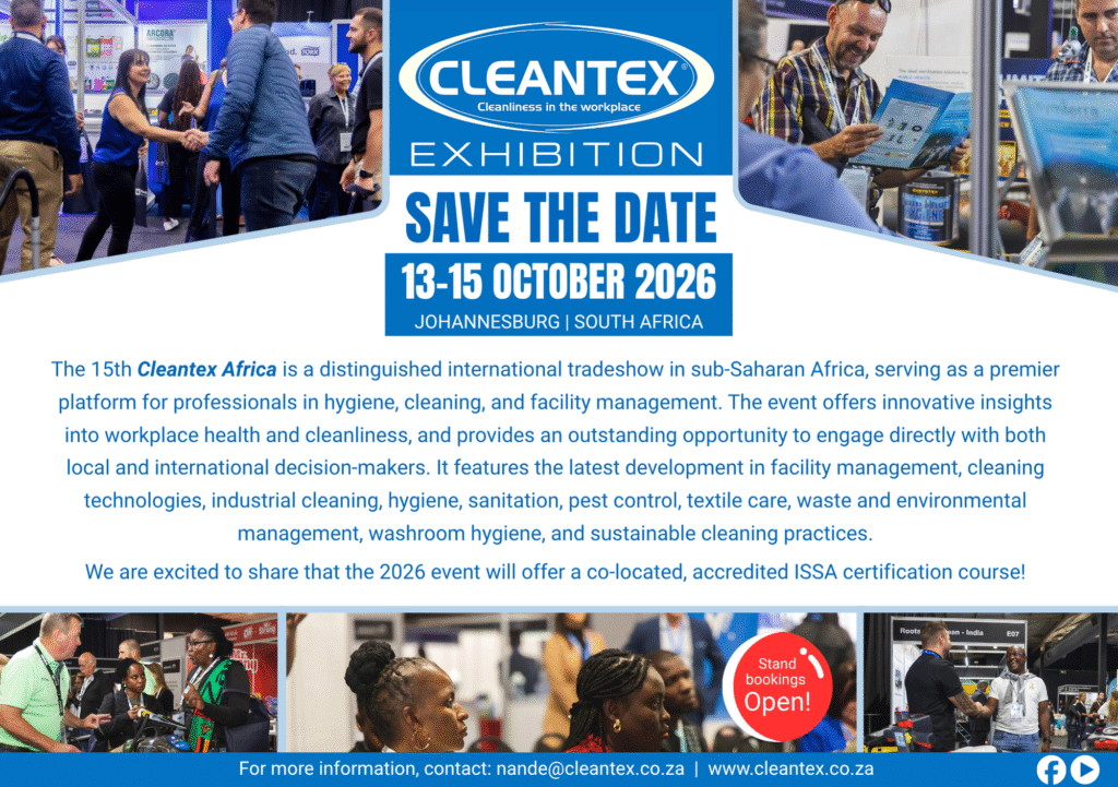 Cleantex Africa the biennial tradeshow that congregates professional cleaning, hygiene, and facility services sector leaders from across Africa will take place in Johannesburg, South Africa from 13-15 October 2026.